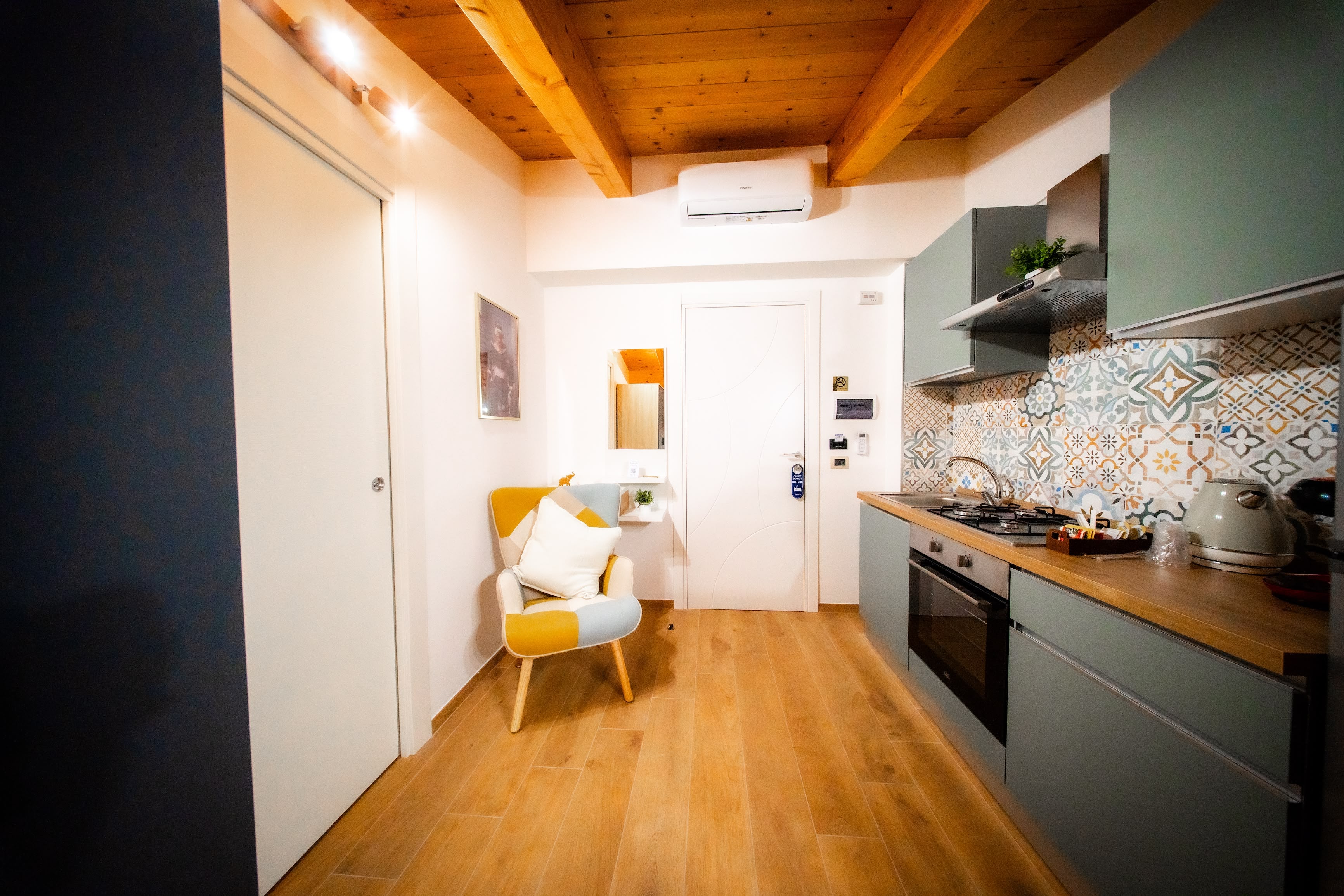 Ambiente luminoso e finemente arredato, ideale per chi cerca un soggiorno rilassante. La cucina attrezzata permette piena autonomia in uno spazio elegante e ben progettato.
